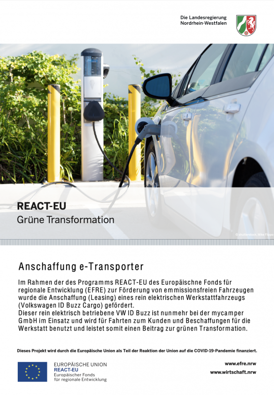Im Rahmen der des Programms REACT-EU des Europäischne Fonds für regionale Entwicklung (EFRE) zur Förderung von emmissionsfreien Fahrzeugen wurde die Anschaffung (Leasing) eines rein elektrischen Werkstattfahrzeugs (Volkswagen ID Buzz Cargo) gefördert.